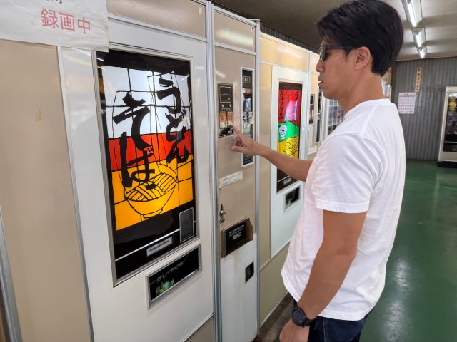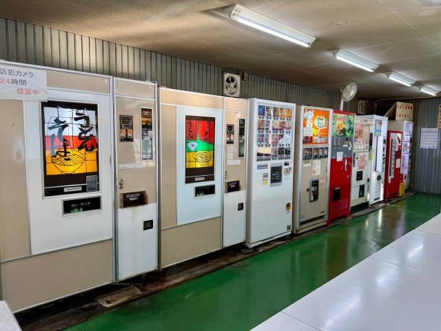 壁際にズラリと並ぶ「うどん・そば」「ラーメン」「トーストサンド」といったレトロ自販機たちは現役で稼働している。ちなみに24時間営業とのこと。