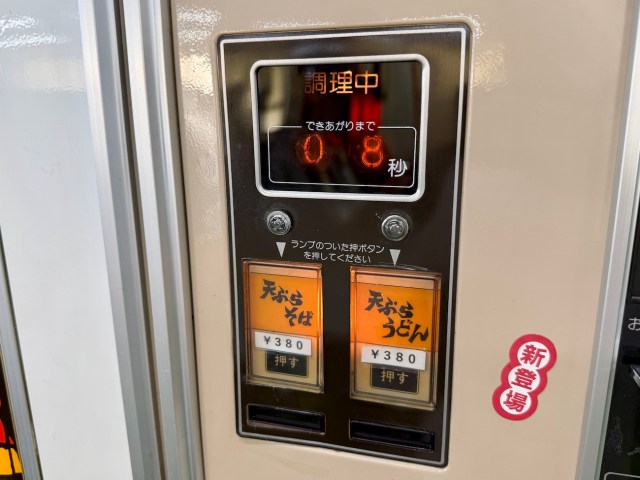 せっかくなので380円の「天ぷらうどん」を食べることにした。硬貨を投入してボタンを押すと、25秒のカウントダウンが始まる。