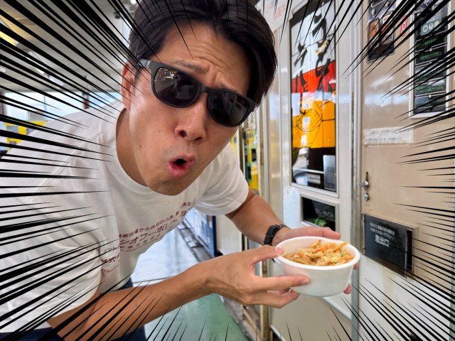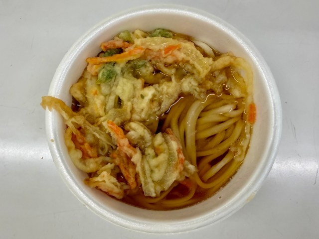 湯気とともに現れたのは、かき揚げ天ぷらがのったザ・自販機のうどん。見た目は普通だが、こういう場所で食べると美味しい。富士山頂のカップ麺と同じ理屈だ。