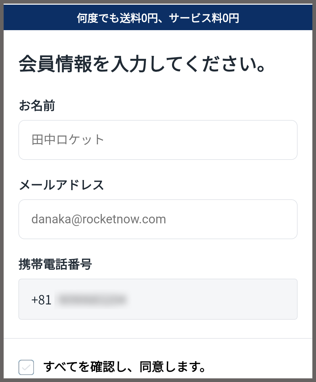 電話番号で認証をして、続いて会員情報の入力。ちなみに初期設定で入力されている名前とメールアドレスはダミーだ。それらの情報を入力したら、利用規約・位置情報の取得・プライバシー通知などの内容を確認して、同意にチェックする。