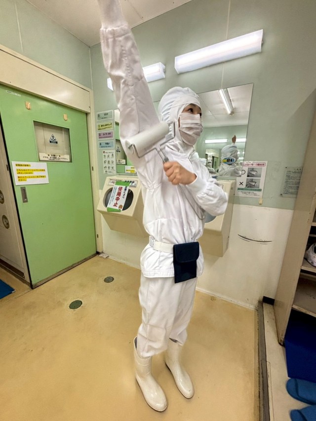 今回は、ガラス越しの見学ではなく、実際に製造現場へ入らせていただくため、白衣・ヘアキャップ・マスクなどを着用していく。