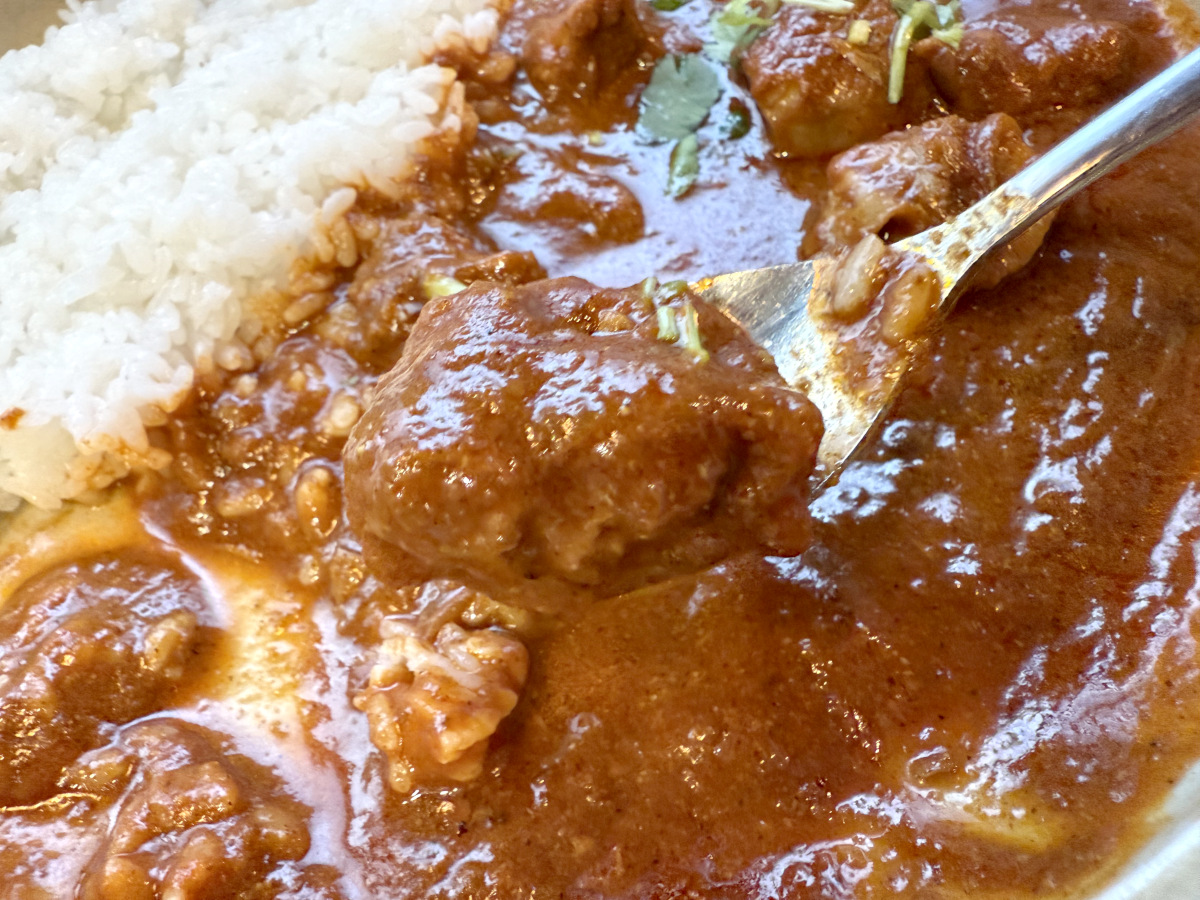 さらに言うとフェンネルのポークビンダルーは肉がめっちゃウマい! やわらかく煮こまれた豚肉はプリプリの食感で、おそらくどのカレーに入っていても「肉がウマい」と感じることだろう。