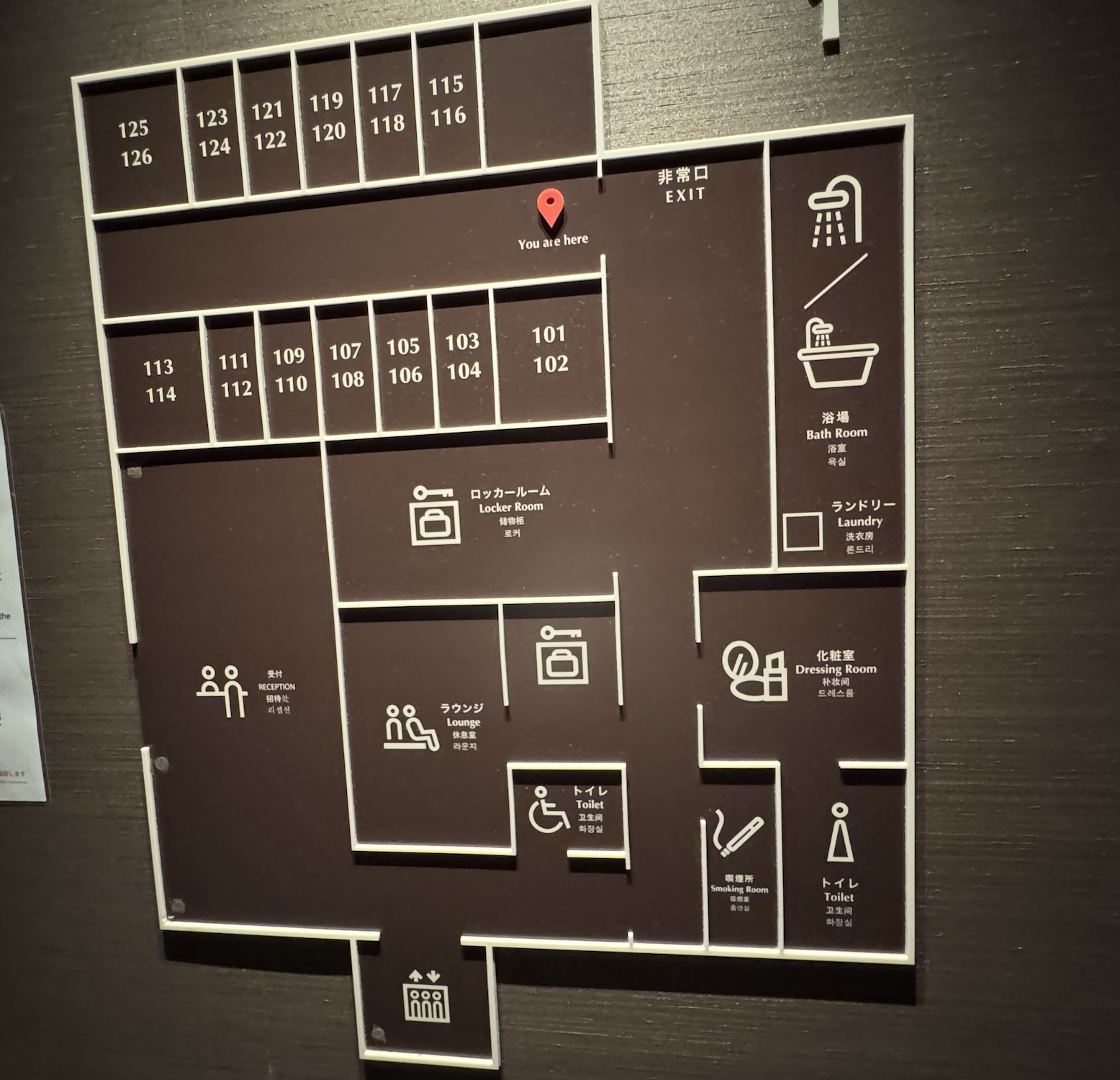 内部は広すぎず狭すぎず。大きな荷物や貴重品はロッカーに入れましょう。