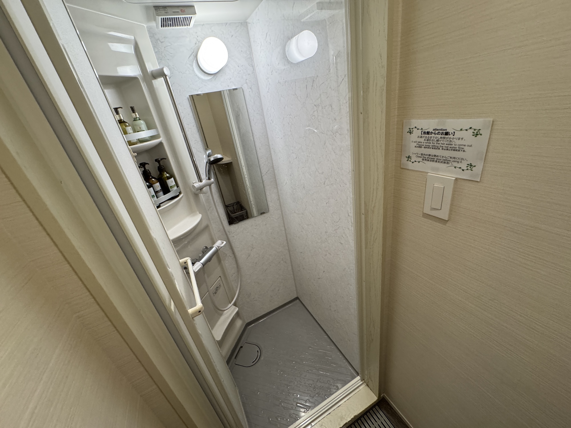 シャワー室に備え付けられたオイル、洗顔、シャンプーにコンディショナーは全て安定のDHC。またドミトリー得意民の観点からいえば脱衣所にカゴ、ちょっとしたモノを置ける台、フックが付いている点はかなりポイント高かった。風呂入って寝るだけならこれで充分(シャワーだけど)。