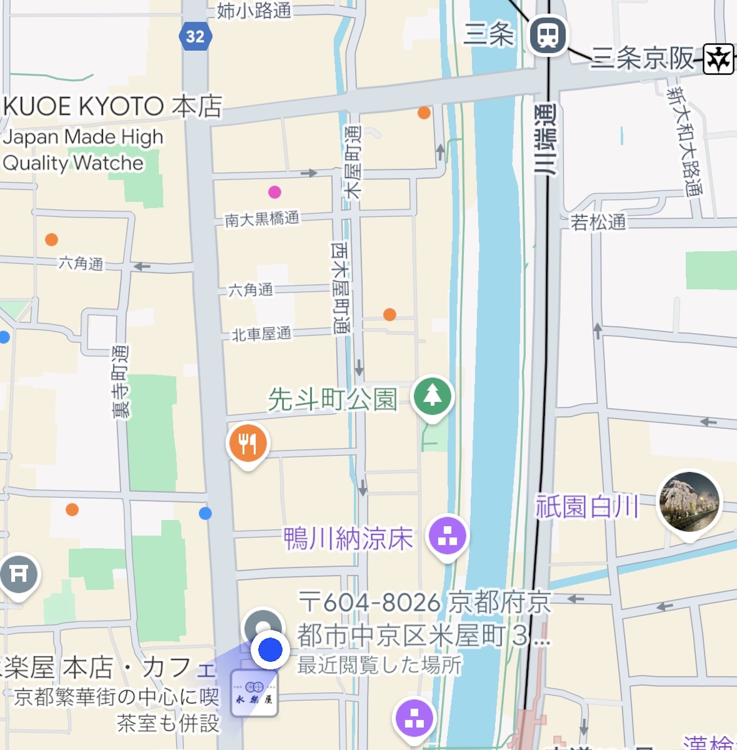 今回私が泊まるのは京都ド真ん中。 “京都といえば” で多くの人が思い浮かべる鴨川とか先斗町とか、そのあたりである。滋賀からのルートを検索すると『三条京阪』駅から徒歩で向かうのが賢明らしい。終電間際の三条京阪駅に下車し、先斗町方面へ向かったところ……