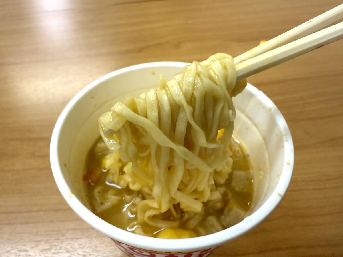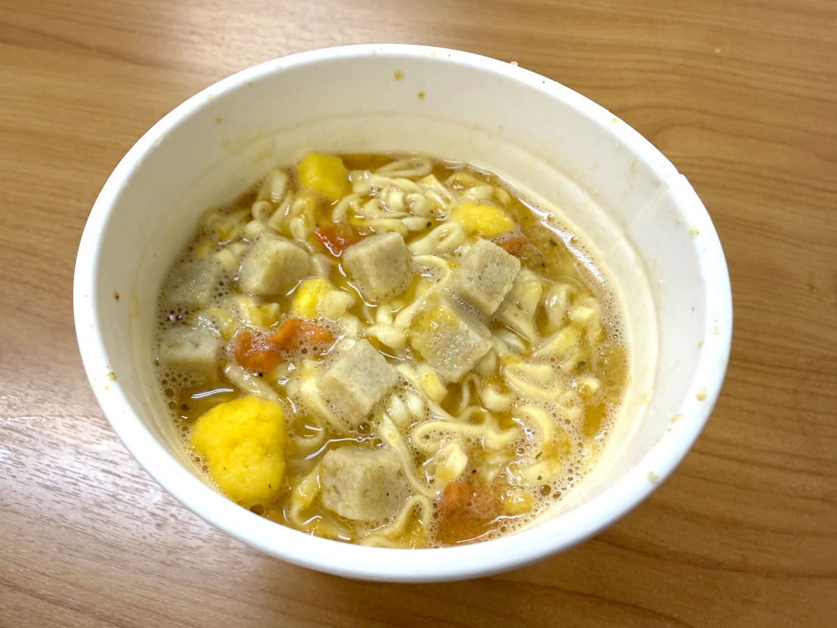 というわけで『カップヌードル ペルー式チキンのクリーム煮込み味』をいざ実食! 美味しいことは大前提として、いかにペルーが炸裂しているかに注意して食べてみることにした。