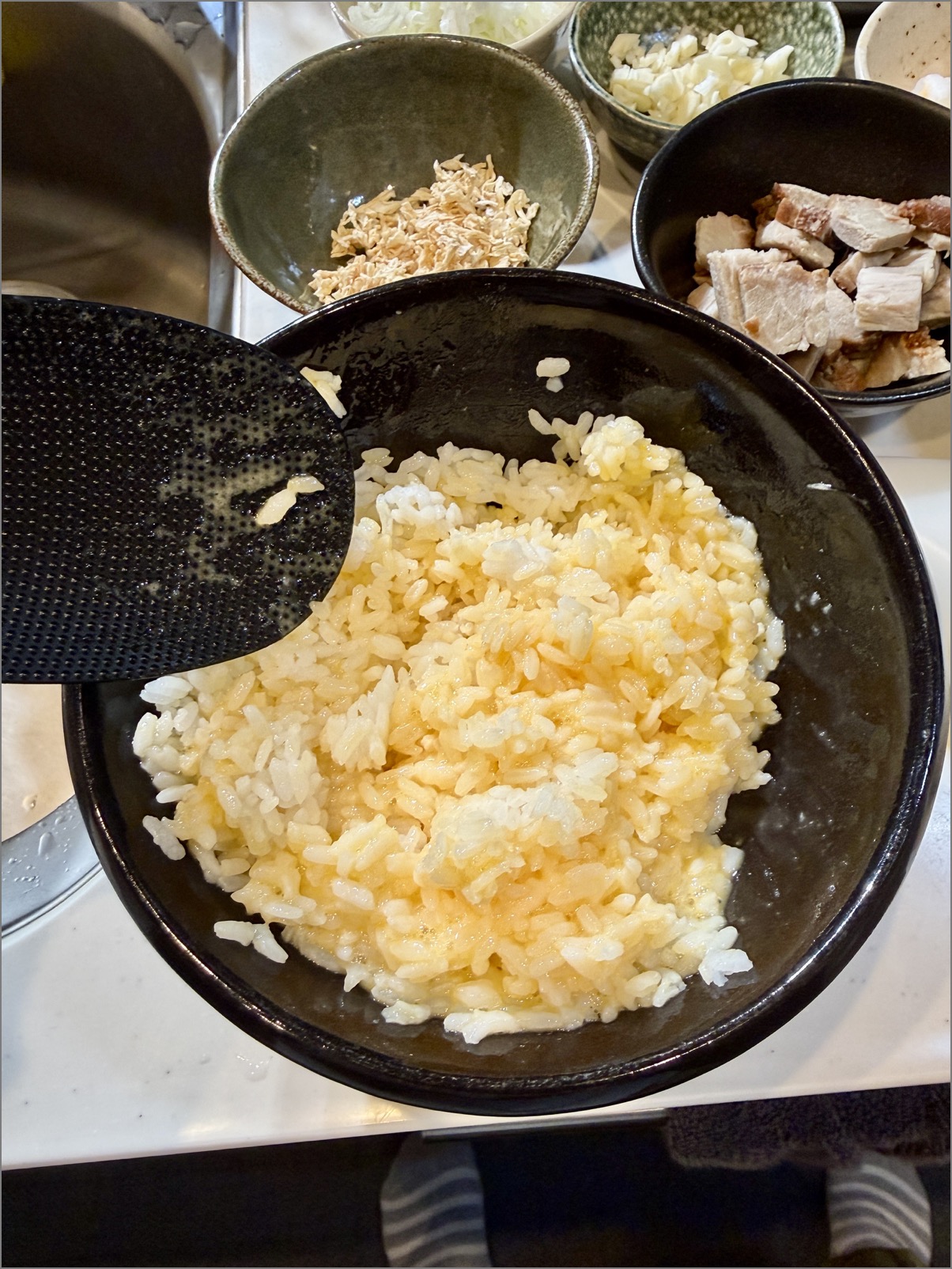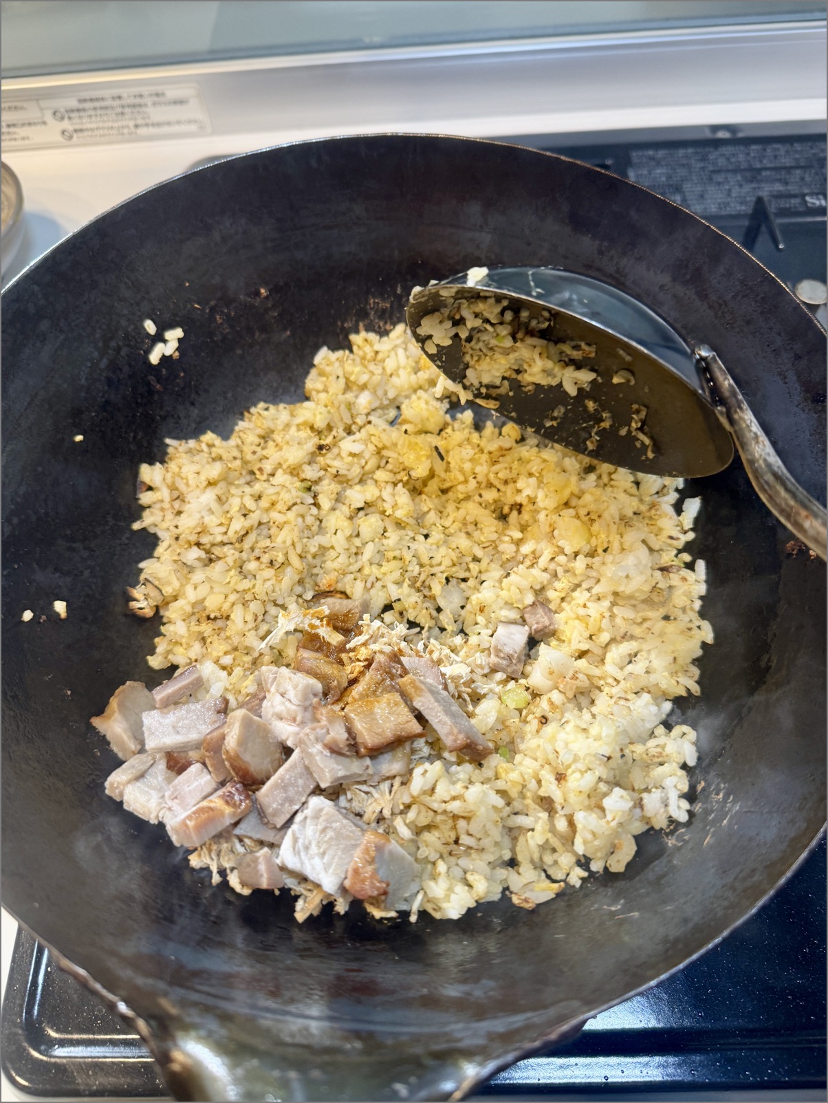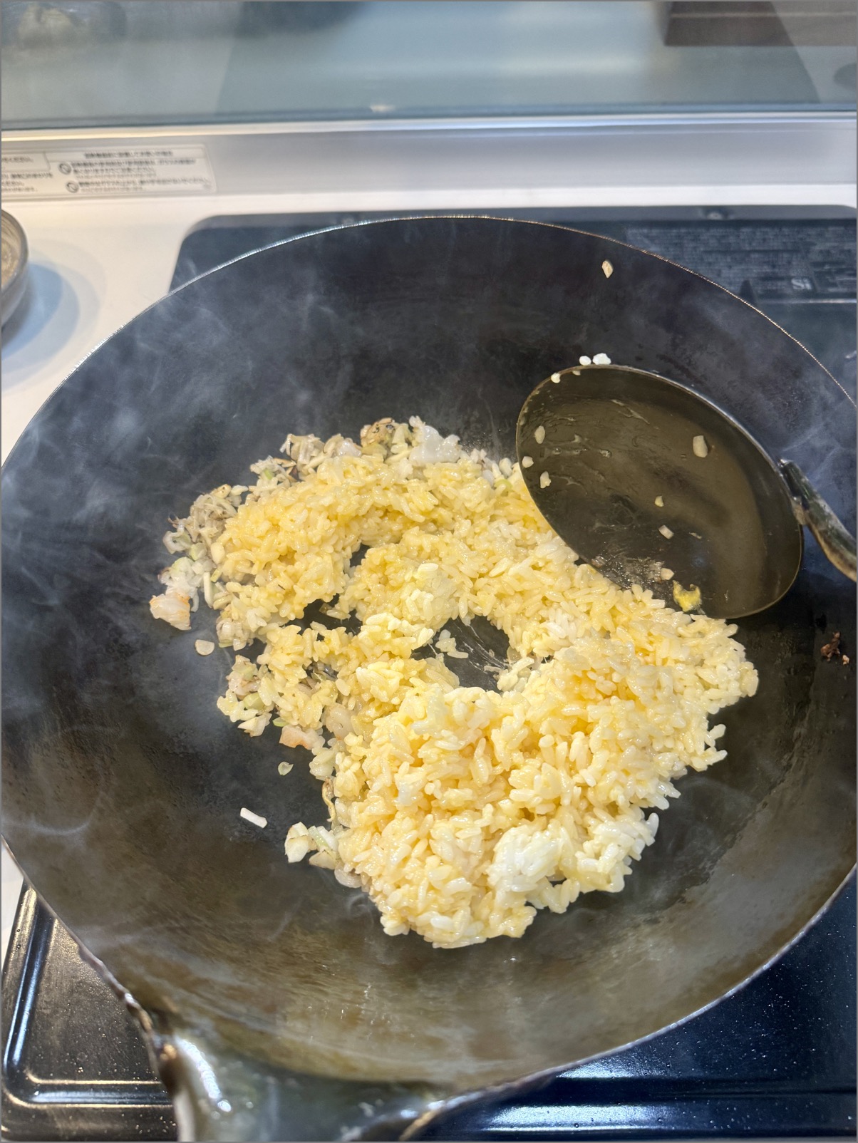 特筆すべきは、たまご2個の使い方。ひとつは最初に炒めて皿に戻し、最後に再投入。もうひとつは、最初にご飯と混ぜ「TKG状態」で炒める……といった二刀流。
