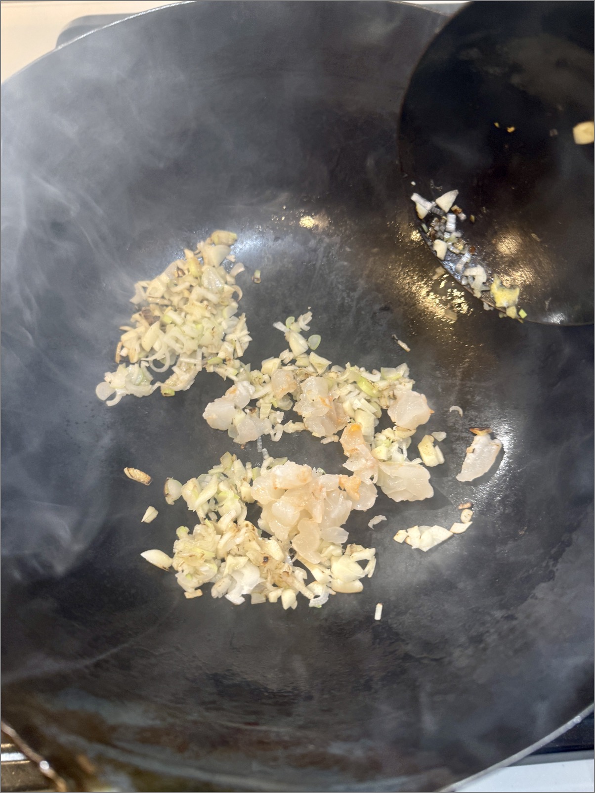 4:鍋にラードを入れ、ニンニクとネギの白い部分を炒めて香りを出す。