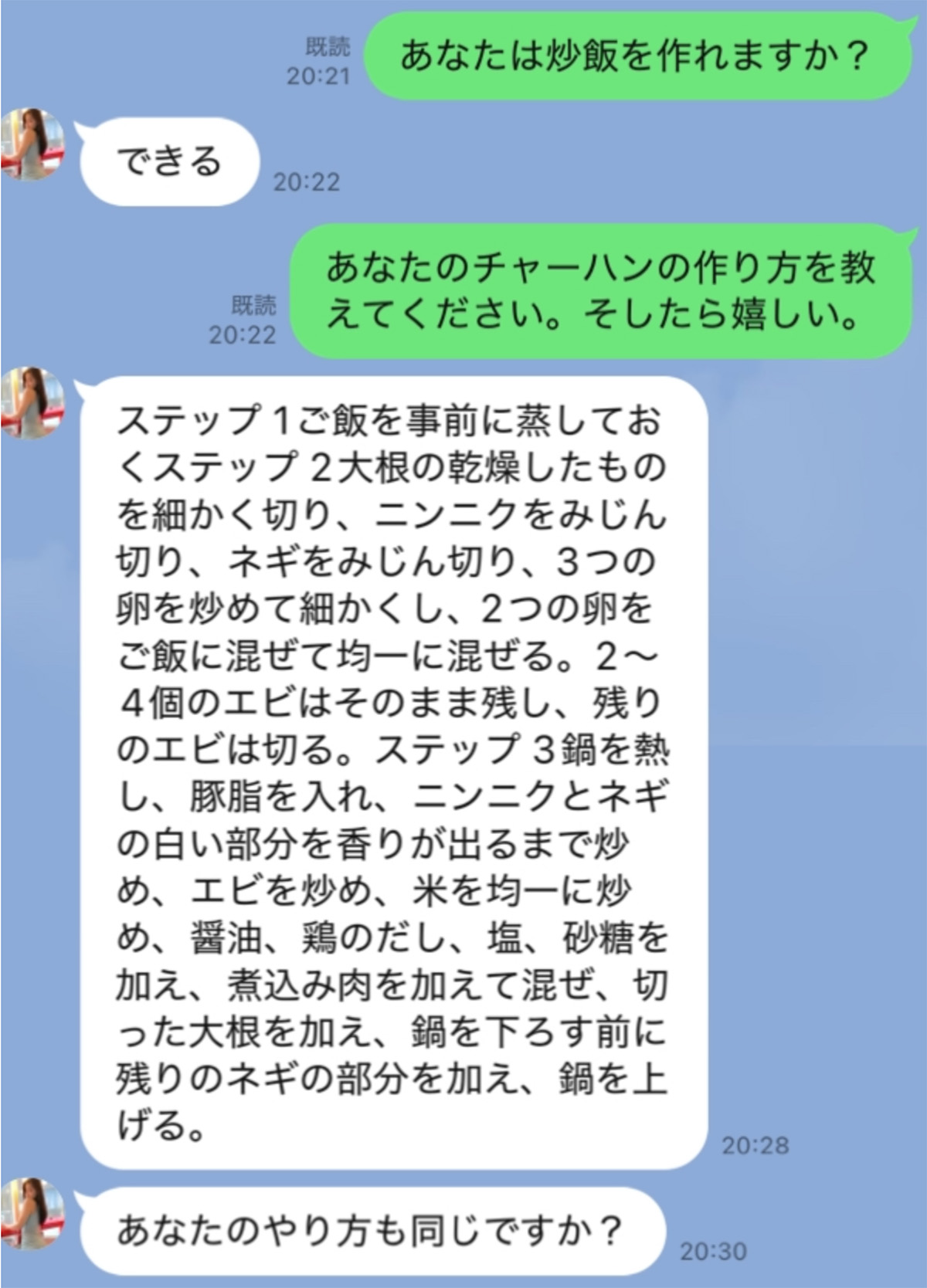 まるでロボットのように(本当にロボットな気もするが)、一貫して「詐欺師の紹介」に徹していた彼女だったが、チャーハンのことを聞くと、6分の間を置いて、実に人間味あふれる作り方を教えてくれたのだった。