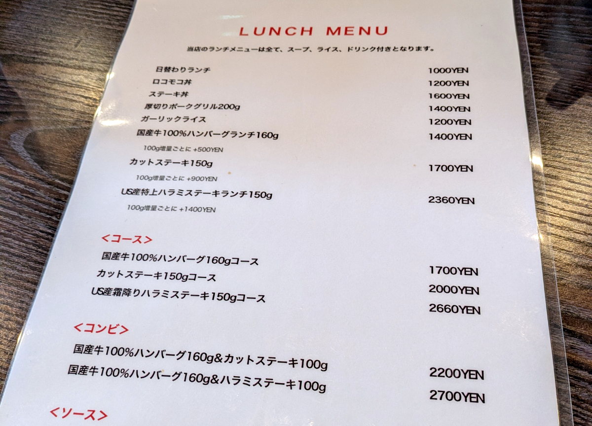 ランチメニューを見ると、1000円の日替わりのほか、ロコモコ丼・ステーキ丼・ポークグリルなどバリエーション豊富だ。