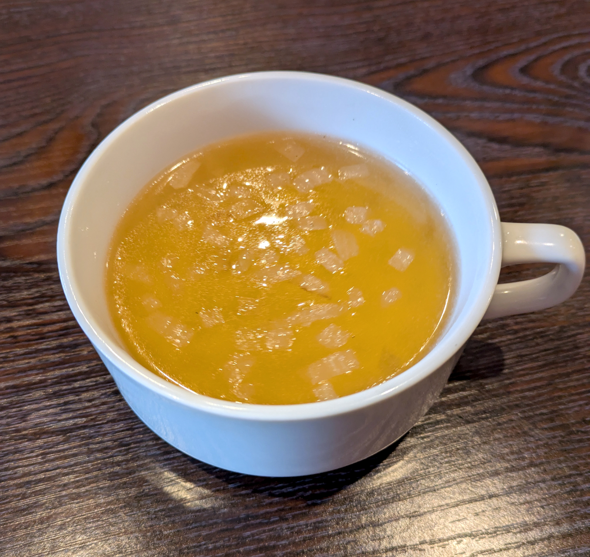 続いてコンソメスープ。浮いているのはお手製のフライドオニオンではないだろうか。玉ねぎの風味が鼻をくすぐる。ささやかなひと手間だけど、これがあるだけで、スープの味が引き立つというもの。