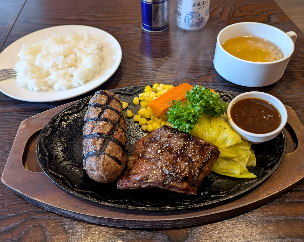 どれにしようか迷った末に、メニュー1番下の「国産牛100%ハンバーグ160g & ハラミステーキ100g」(税込2700円)をオニオンソースで注文した。意図して高いモノにしたわけではなく、直感的に食べたいのがコレだったので、あとで値段を見て、1番高いことに驚いた。
