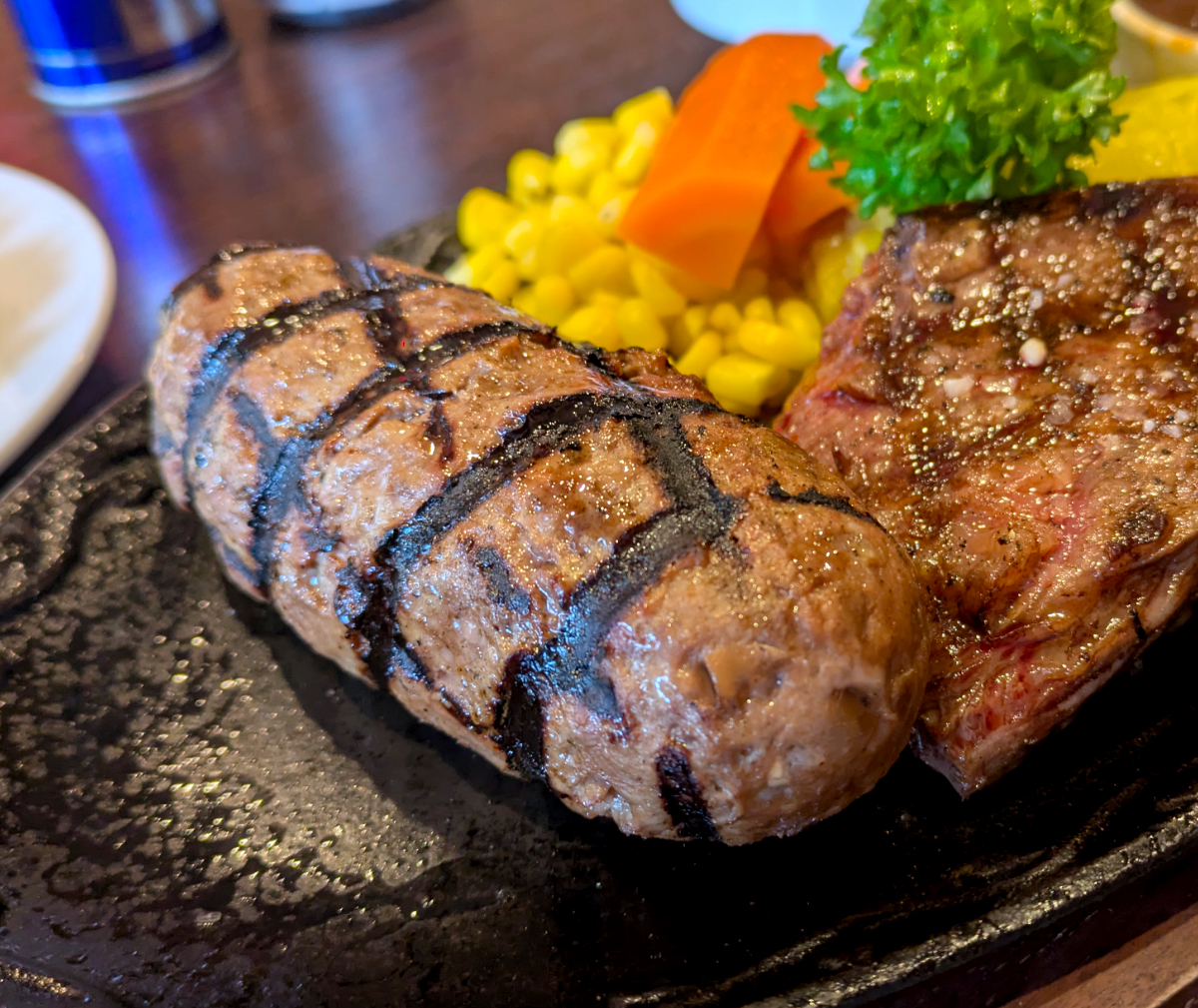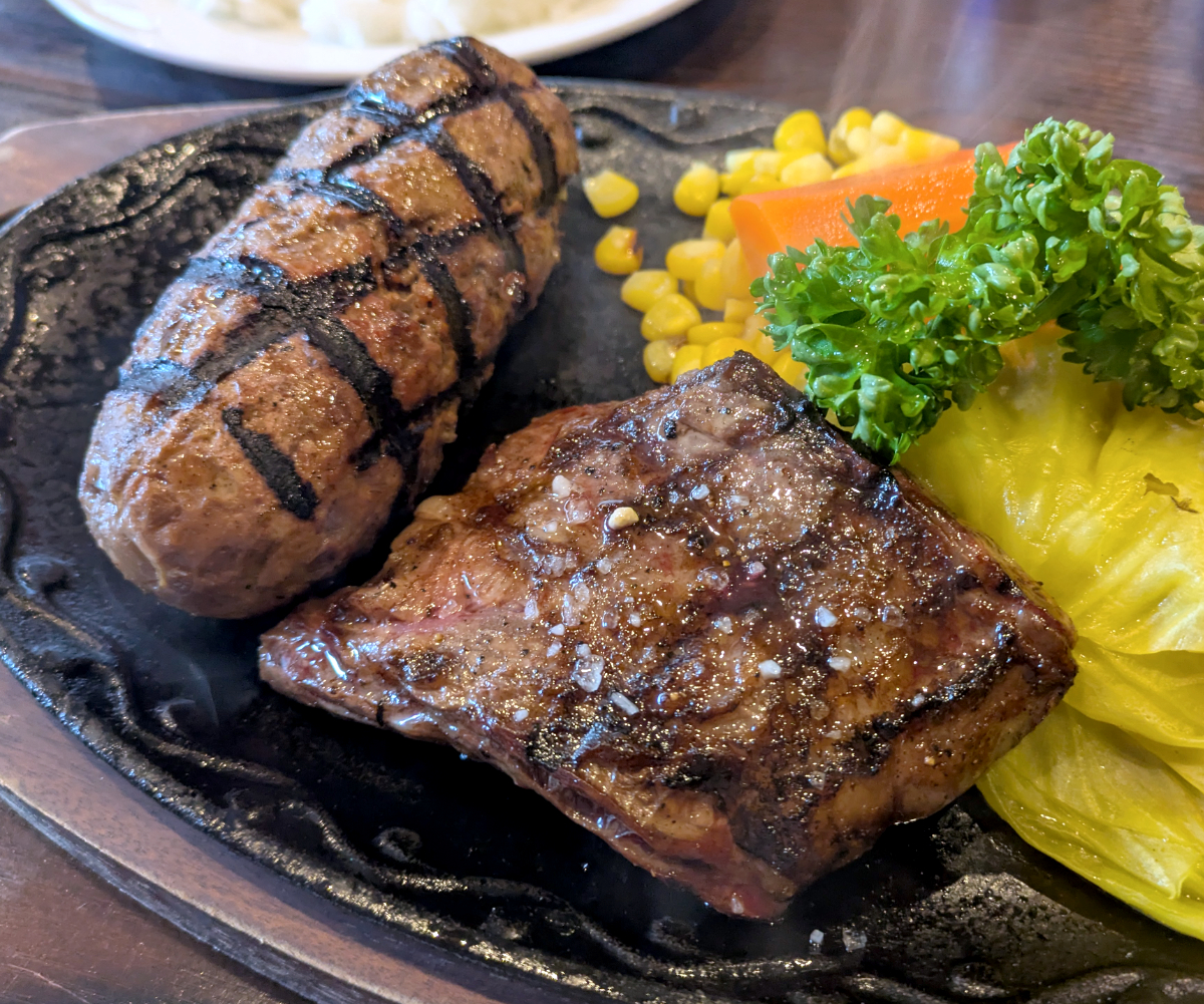 そしてアツアツの鉄板にのって出てきた、ハンバーグとハラミステーキ!