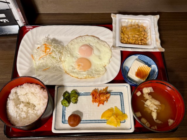 白ごはんと味噌汁、そして目玉焼き、納豆、漬物という王道の和定食スタイル。サウナで目覚めた朝の体に、バランスの取れた和定食が驚くほど染みる!
