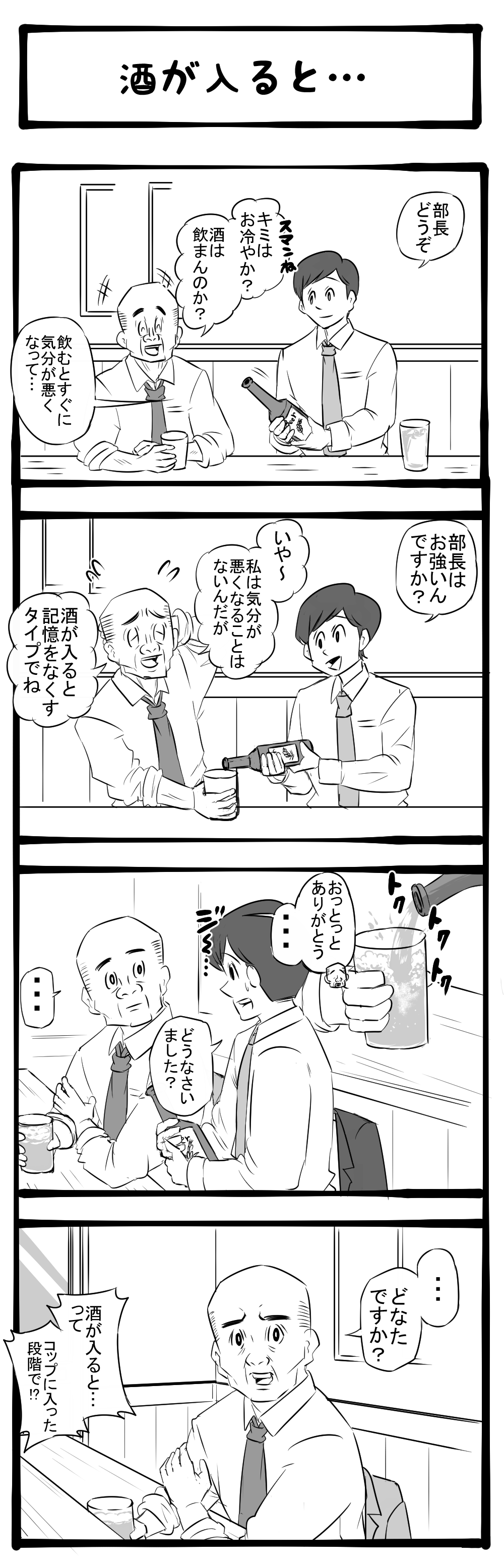 飲んでからなれ! 部下に注いでもらう上司! 四コマサボタージュBYD第221回「酒が入ると…」