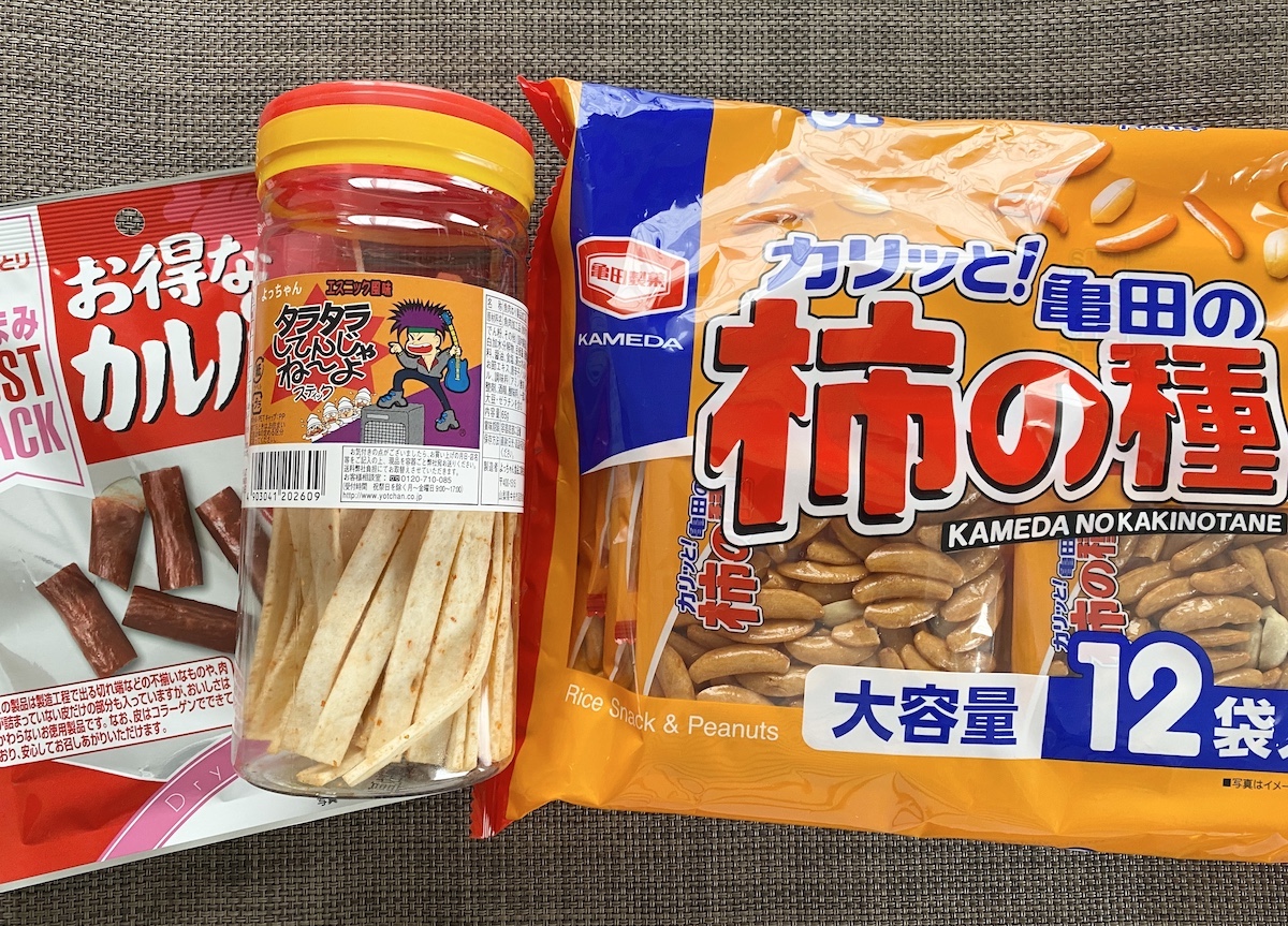 「おかしだけでなく、お酒のツマミが安く買えるのも「まちおか」のいいところ。大容量だとさらに安くゲットできるから、もし好みのツマミがあるなら探してみるのをオススメしたい。
