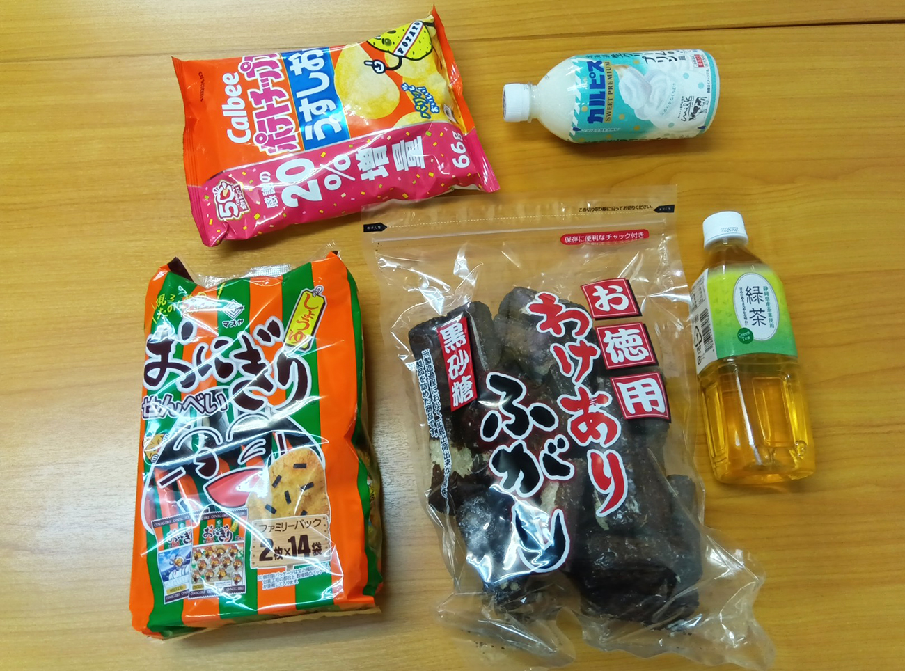 そんなおにぎりせんべいが『おかしのまちおか』には売っているではないか。スゲエ! というわけでおにぎりせんべいを中心にコスパの良いもので打線を組んだ。おかしのまちおかオリジナル緑茶など飲み物が地味に安いのもポイント」