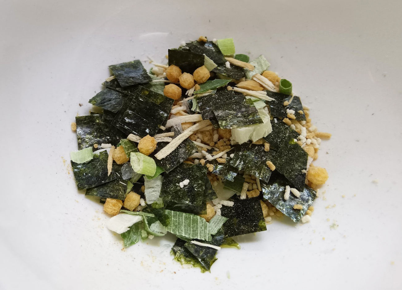 海の香りが濃い。食べた瞬間、ふわっと漂う海の風味がほたて味より強くて、さらによく味わうと塩辛さが普通のお茶づけ海苔よりはクリーミーなニュアンスである。