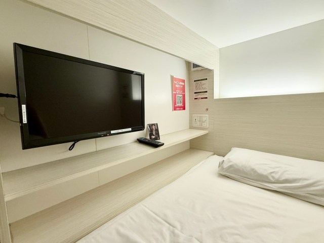 カプセル内は広々としていて、大型テレビや専用ロッカーも完備。落ち着いたデザインで清潔感もある。