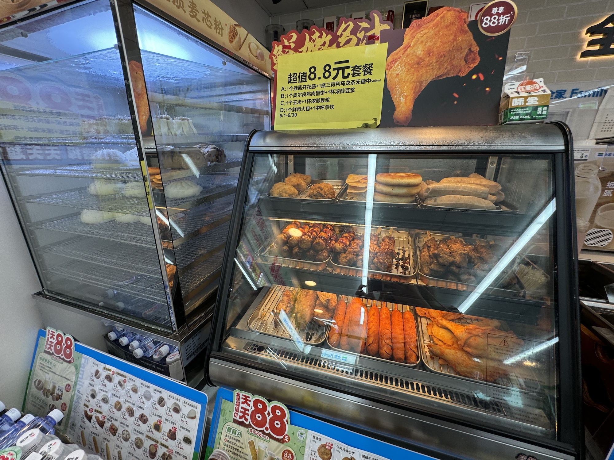 肉まんケースの横にはフライドチキン、フランクフルトといったホットサンドが並ぶ。日本とほぼ一致。