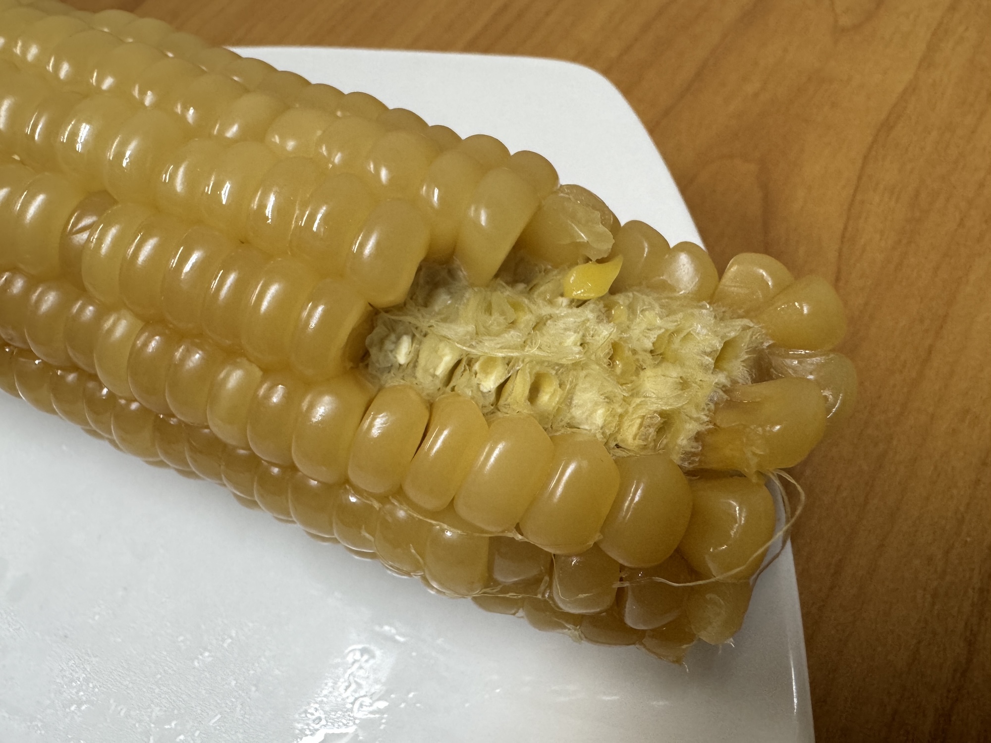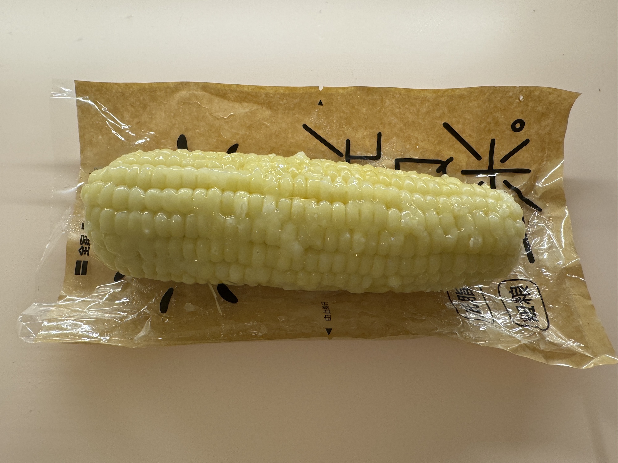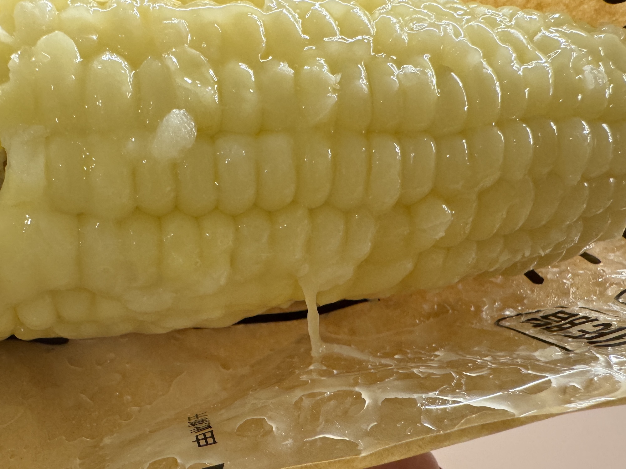こちらが中国ファミマのとうもろこし。ホワイトコーンのような白っぽい色合いで、パンパンに詰まった粒がギッシリ。それはそうと……