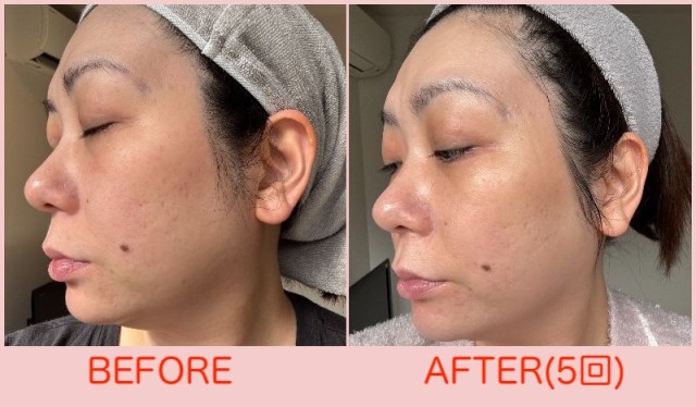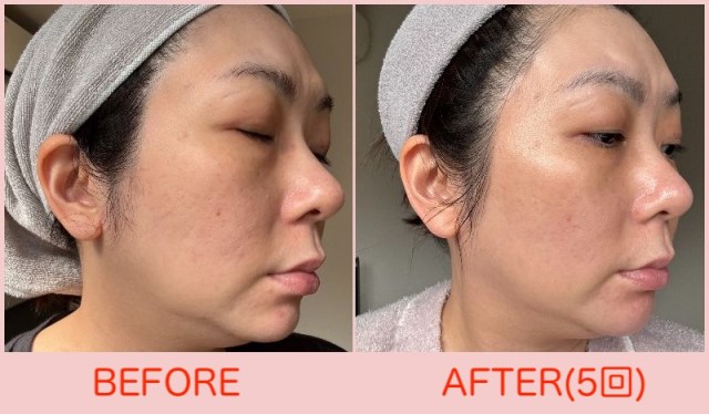 写真を比較すると、少し肌にツヤ感が出ているのがわかるだろうか。これはコラーゲンが生成されて肌にハリが出て質感が均一になったので、ツヤが出るようになったから。