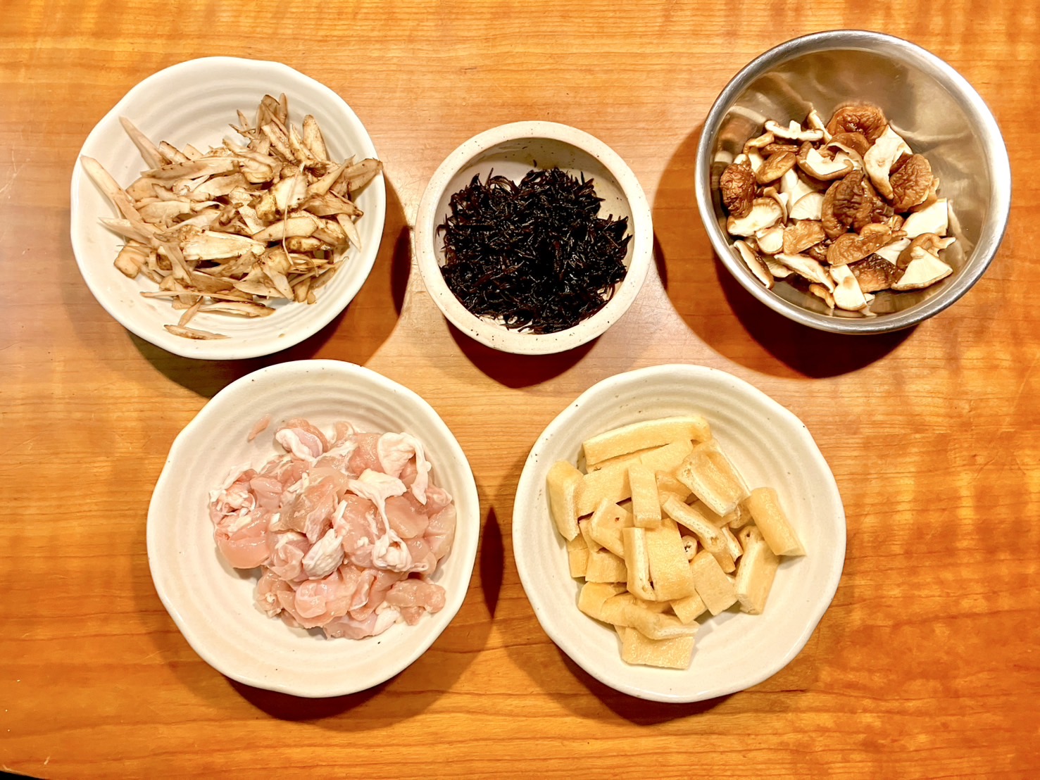 その間に、具材を切ったり水で戻したりしておこう。
