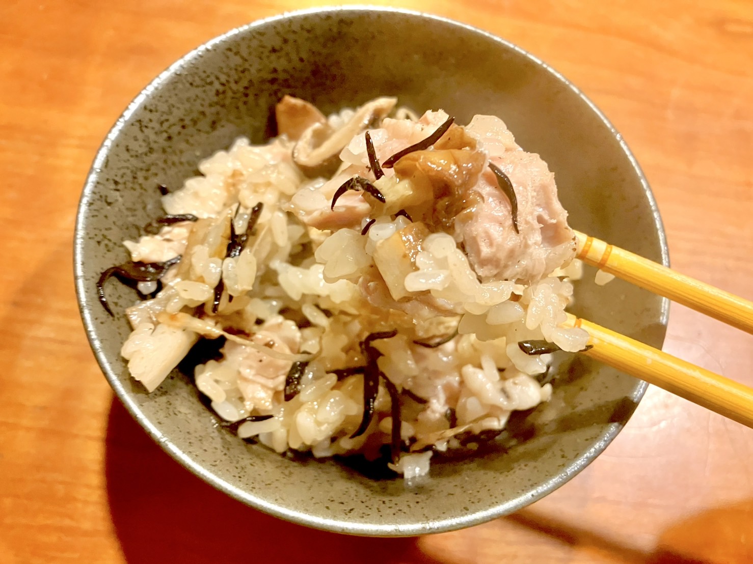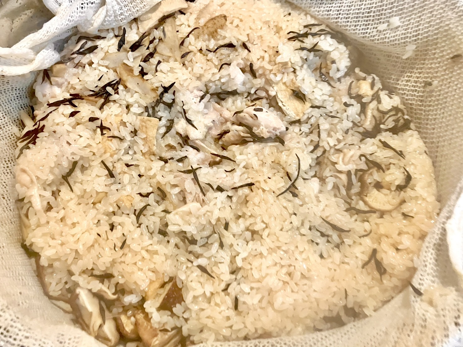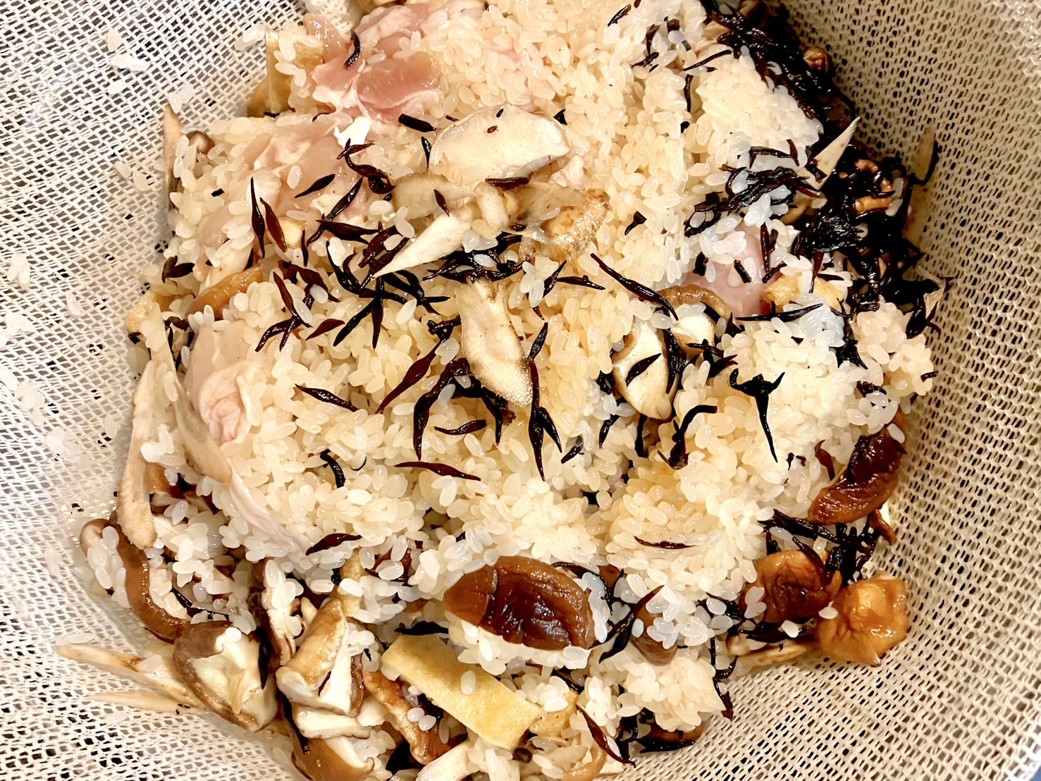 蒸し器でお米を炊くのが初めてだったのでうまくできるかドキドキしていたのだが、ちゃんともちもちになってる!! 鶏肉にもしっかり火が通っていて安心だ。