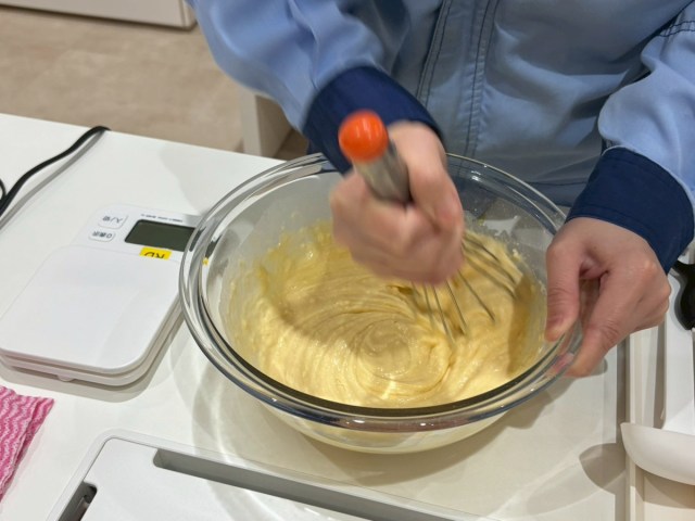 ここが最初のポイント。ミックス粉を最初から入れてしまうと、グルテンができやすくなったり、ベーキングパウダーが反応してしまったりすることで焼き上がりがふんわりしづらくなってしまうのだという。