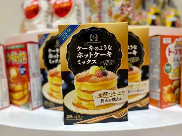 一つ目は定番の「SHOWAホットケーキミックス」。今年9月から、小麦や糖類の種類と配合を見直し、さらにふんわりと、くちどけのよい食感になったそうだ。リニューアルを記念して数量限定で展開されている、「パンどろぼう」とのコラボパッケージも激カワだ。
