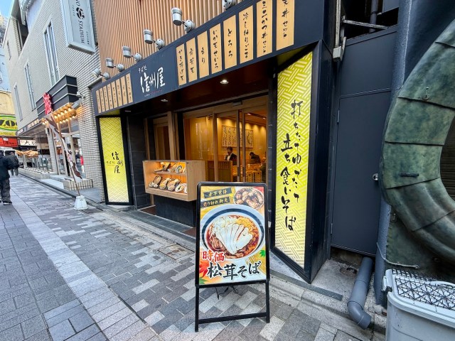 そんな会話をした直後、会社帰りに新宿駅南口のそば処「信州屋」の前を通りかかったところ……「松茸そば(時価)」なる看板を発見。まさにさっきまで話していた松茸である。味はもちろん価格も気になったので思い切って入ってみた!