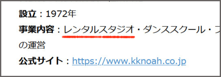 飲食店関係の会社かと思ったら、事業内容の1番最初に「レンタルスタジオ」とあった。