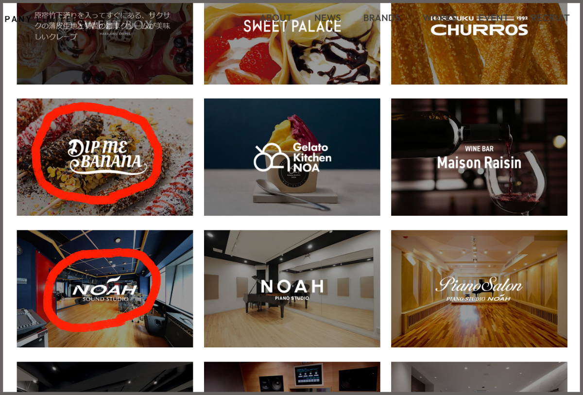 公式ページにアクセスして、事業内容に関する「ブランド」という項目を見て、私は驚いた! 都内を中心に多店舗展開している「音楽スタジオNOAH」の項目の真上に、チョコバナナ専門店があるじゃないか!