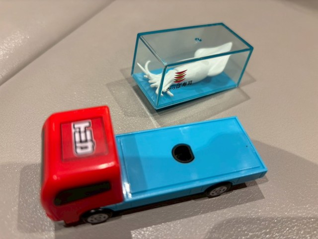 税込3500円以上の飲食またはテイクアウト利用で、先着順でもらえるのはなんと「トラック(暗いところで光るいか)」という、遊び心満載のミニカー。