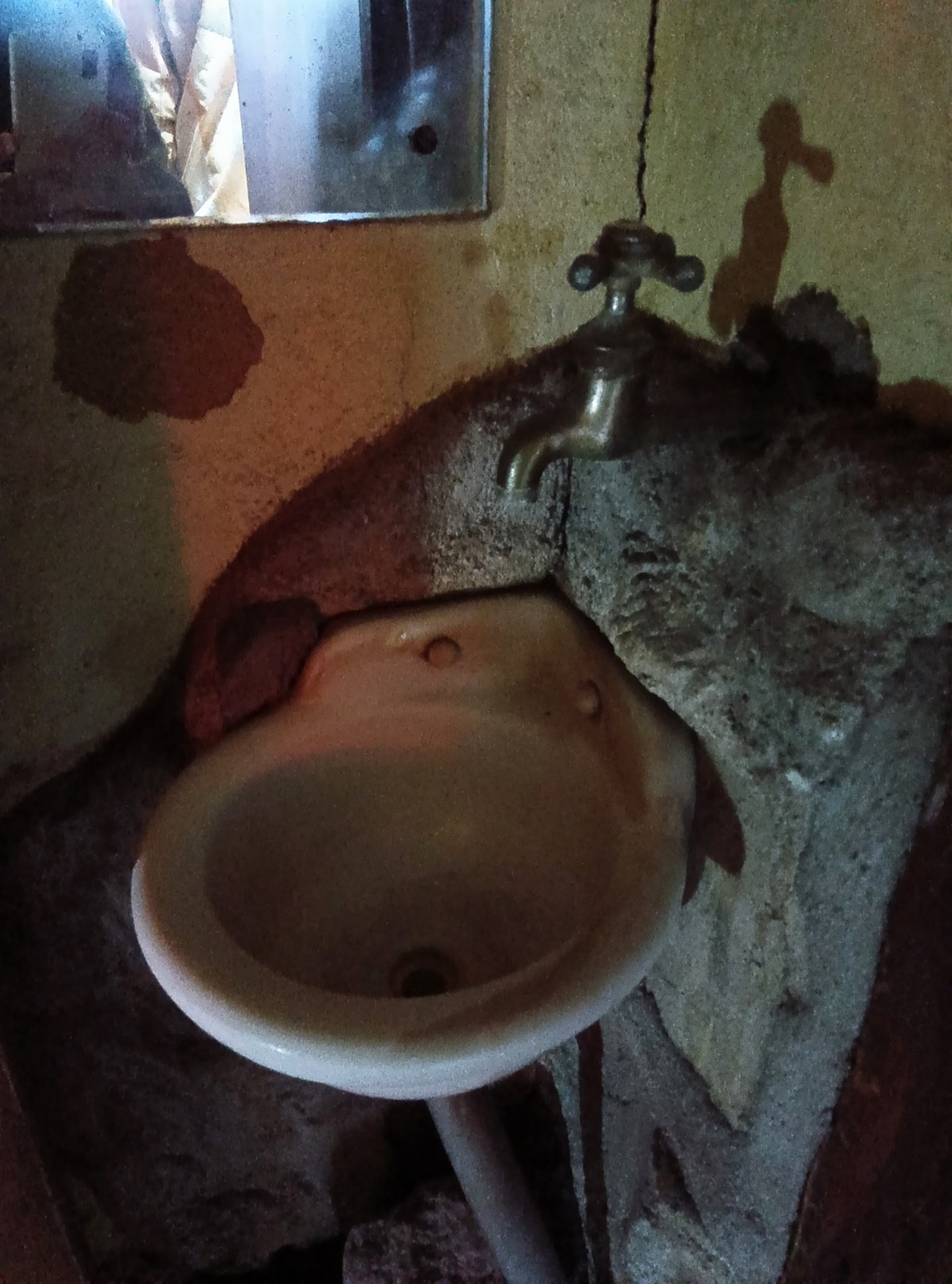 ▼突き当りに小さい石造りの洗面所みたいなのがある