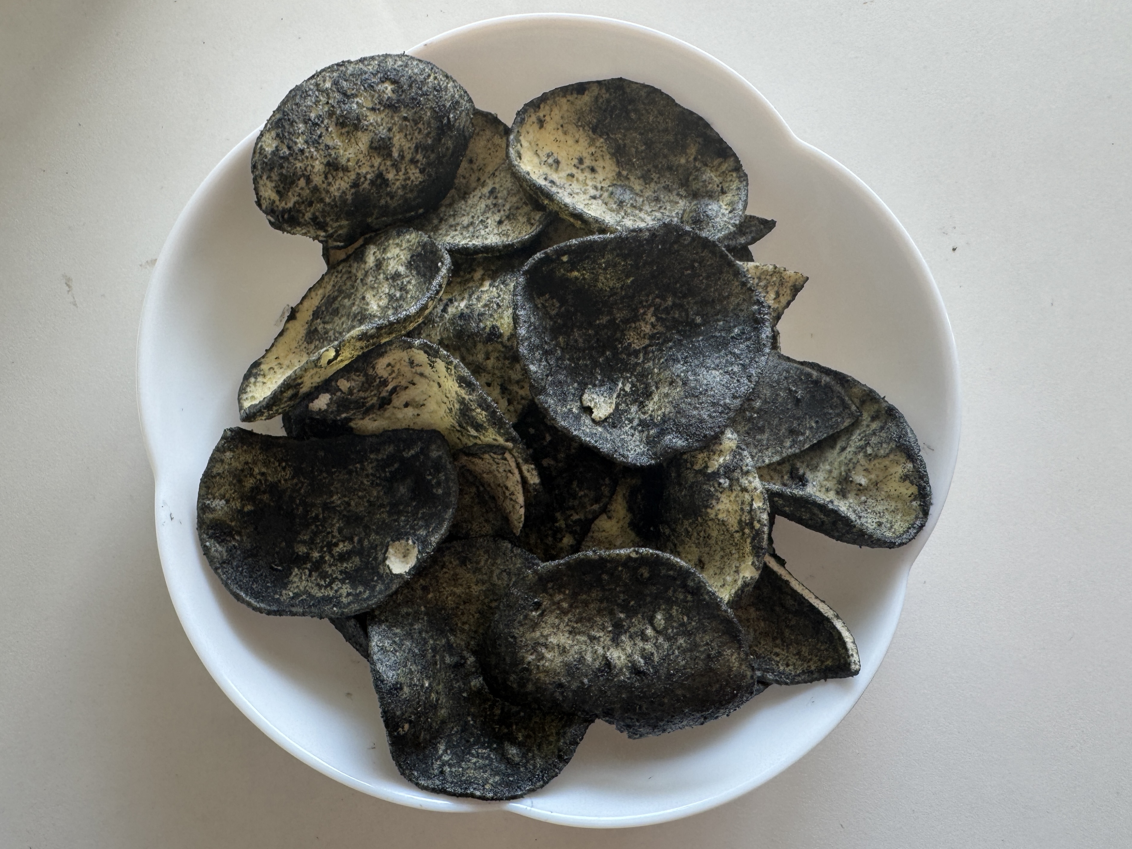 さてブラックポテトを開封すると、ほのかに「カレーせんべいの匂い」が漂った。