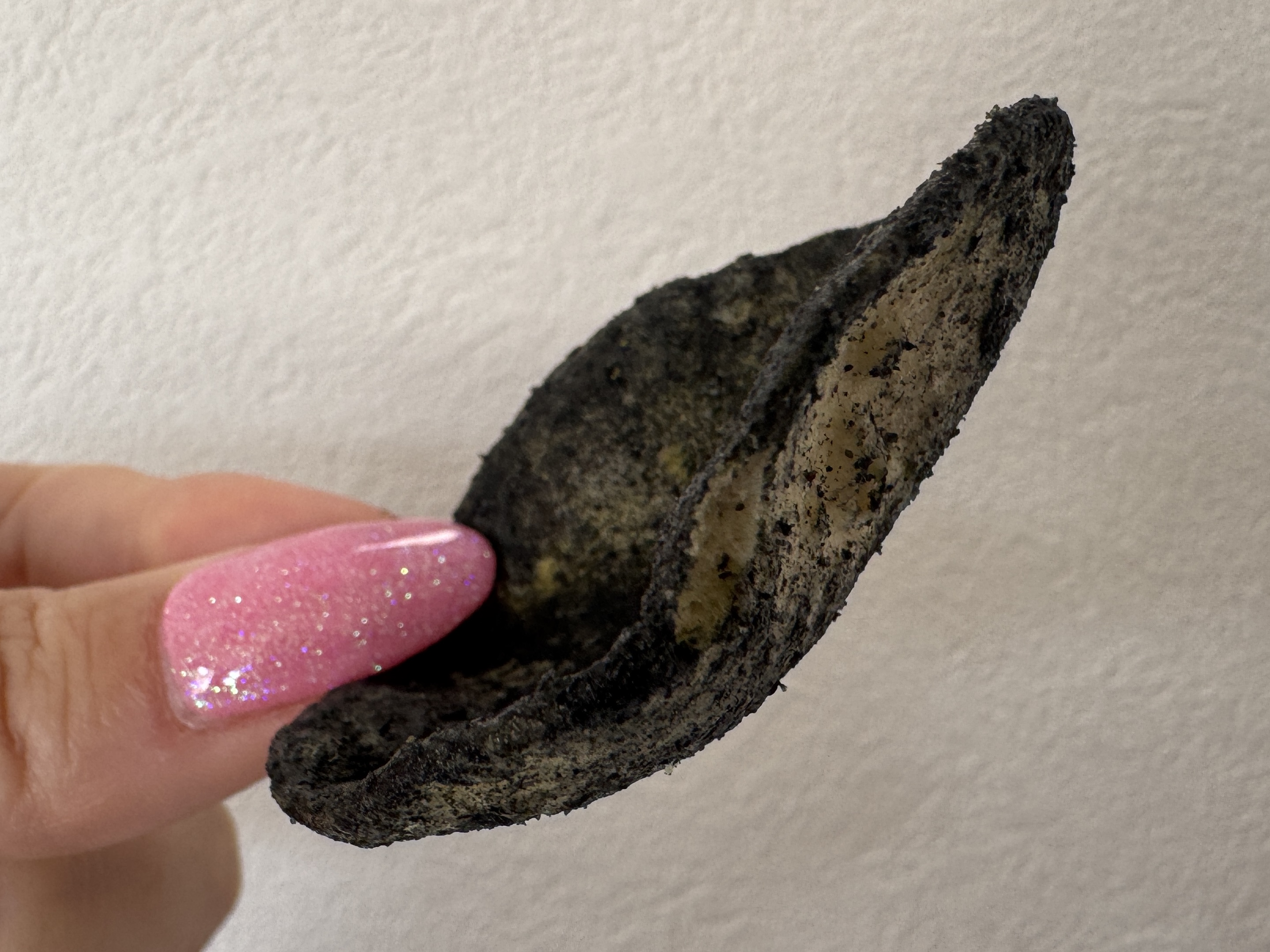 そうか、生地に黒を練り込むとグレーになるのか……! 「ジャッジが厳しすぎやしないか」「もう黒判定でいいのでは」という意見も聞こえてきそうだが、私はあえて「これはグレーだ」と断じたい。なぜならドンキのあくなき情熱と努力は、いつかきっと完全なる漆黒のお菓子を生み出すはずだから。