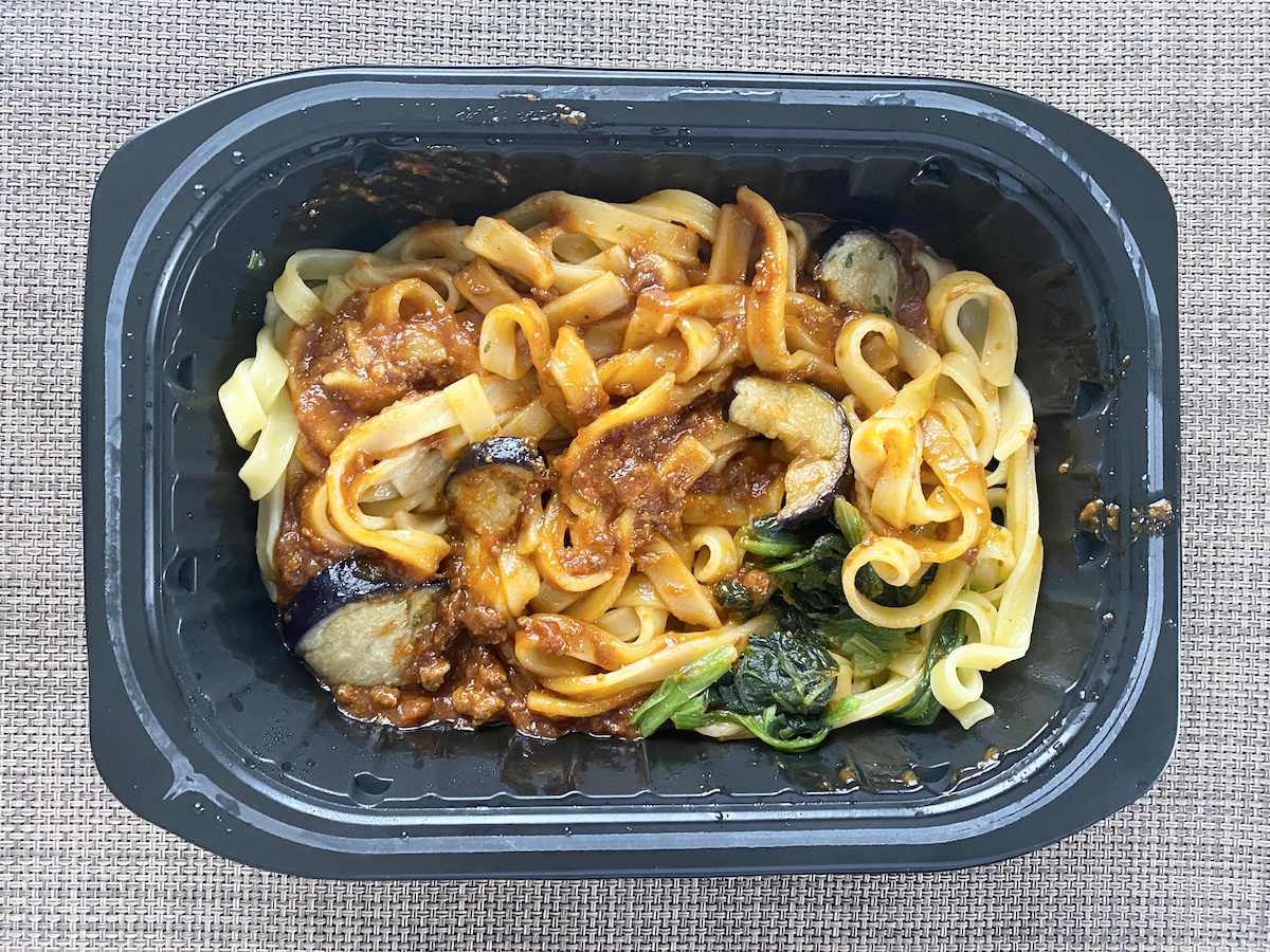 ▼ウエルシアのボロネーゼ(321.84円)。全体的に濃厚で食べ応えあり。麺も特徴あって、心地よい酸味もよし。容器をそのまま捨てられるのも◯。