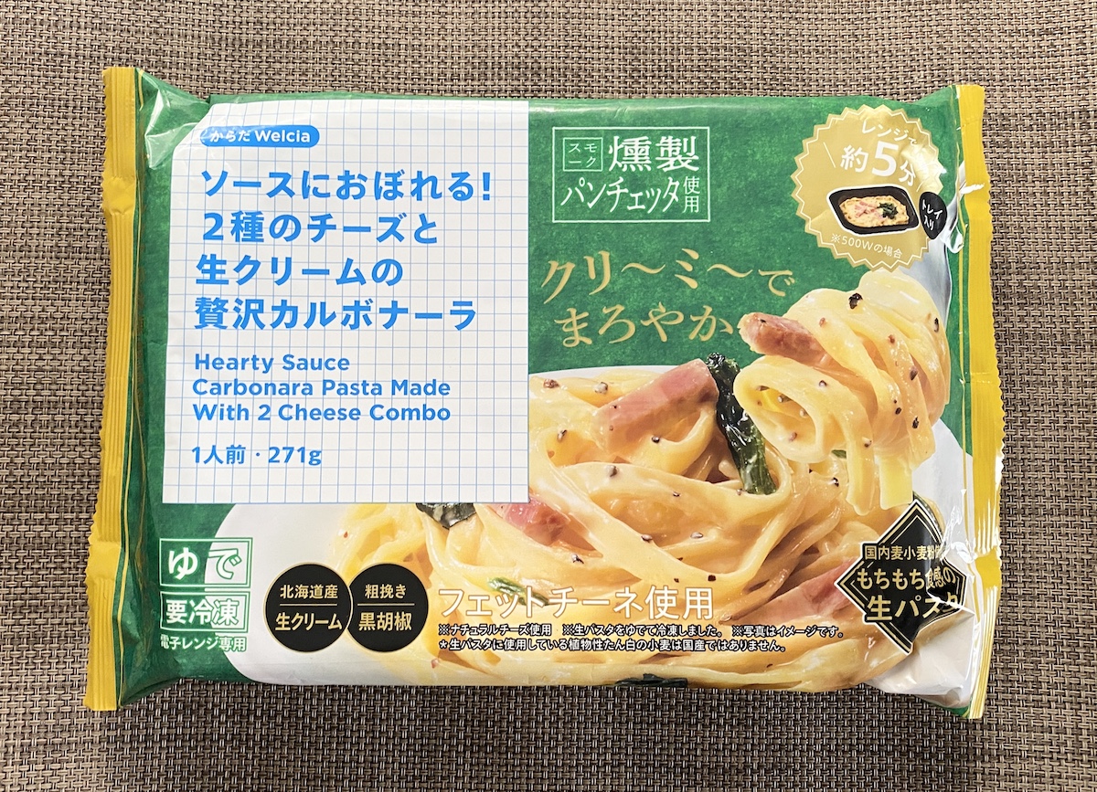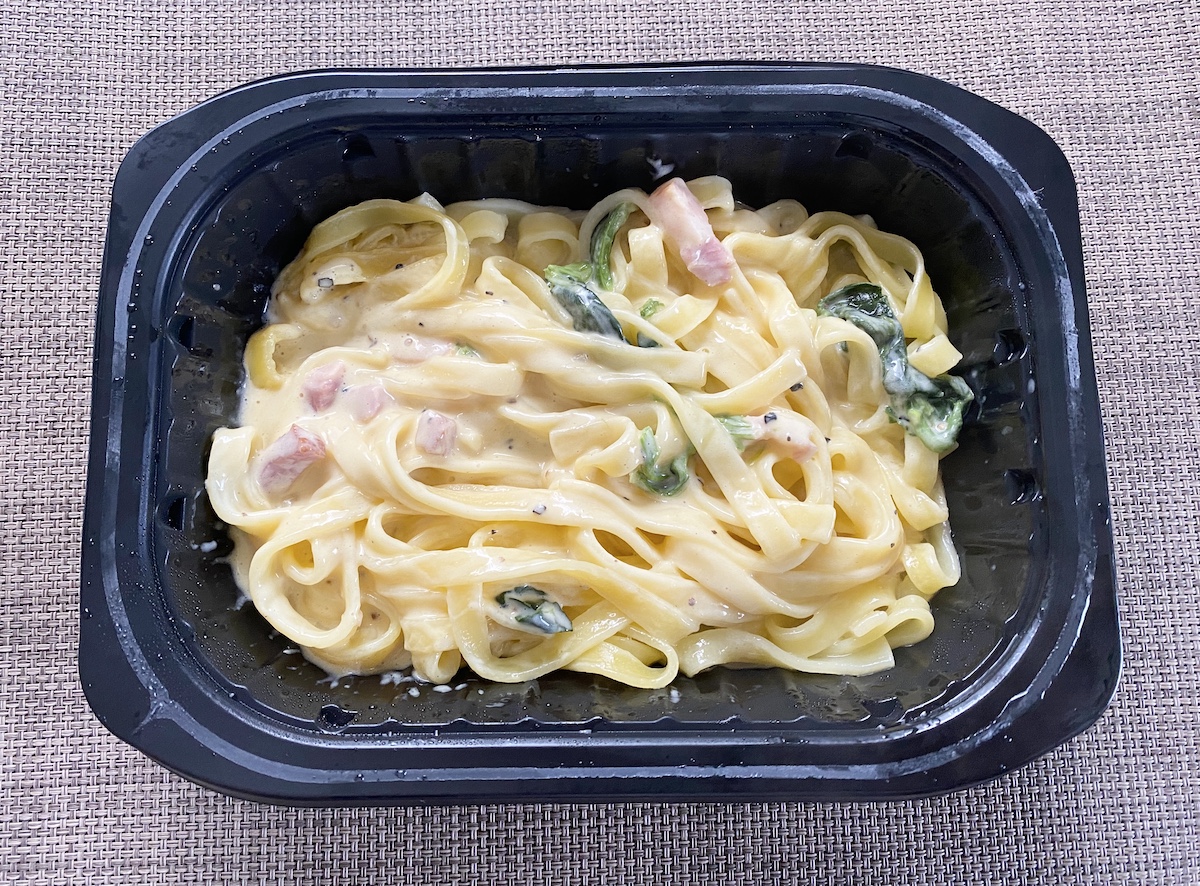 ▼ウエルシアのカルボナーラ(321.84円)。ソースにおぼれるという表現そのまま、なかなかの絡み具合。しっかり味が濃くて美味しい。時折、黒胡椒(?)のピリッとしたアクセントがよき。