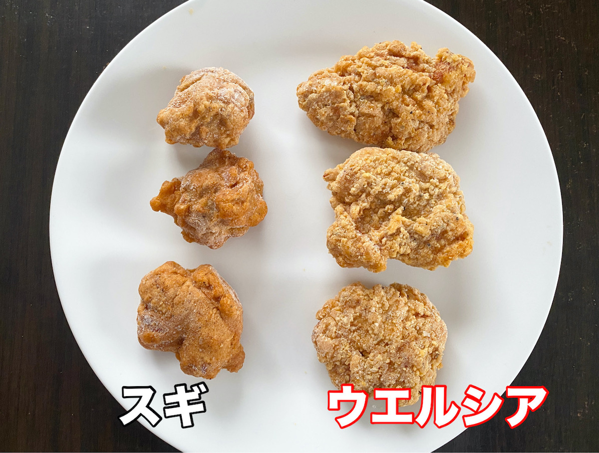 最初に出したスギの唐揚げでも大きめだなと思ったのに、ウエルシアはさらにその上。伊達に自ら「食べ応えのある大きなから揚げ」と言ってないサイズだ。まさか大きさでビビらされるとは……。