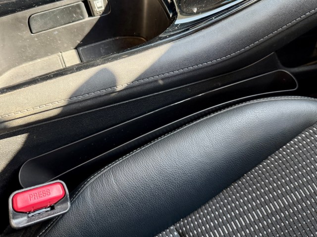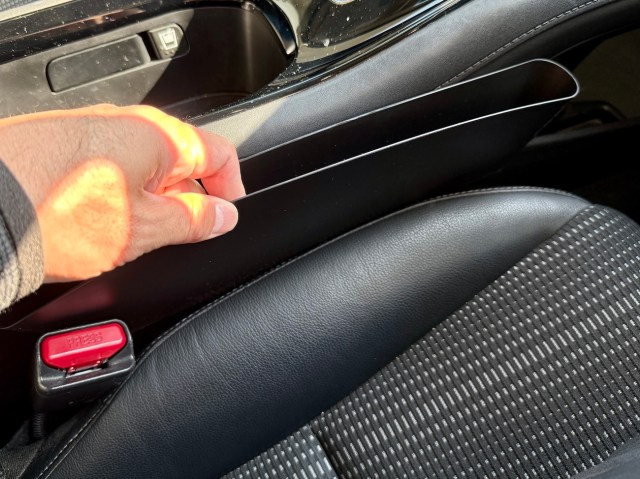 そんなわけで選んだ110円のシートポケットを、さっそく車に乗り込んではめ込んでみる。説明書にはそのまま「シートとセンターコンソールの間に差し込んで使用します」と書いてあるので……