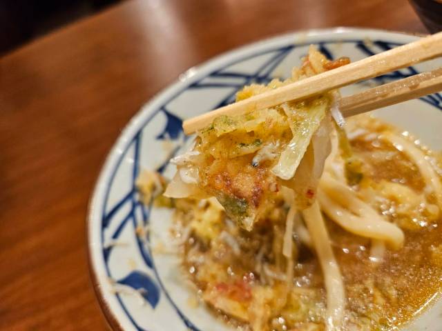 まずは温かいverから食べてみよう。てか……かき揚げデカすぎ!