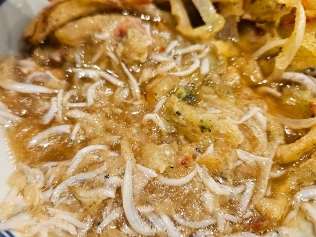 超デカいかき揚げが出汁に溶けてくると……先ほどまでの上品路線から打って変わってこってりパワフルな味わいへと変化を遂げるのだ! 魚介系の旨味が濃縮され中毒性がバツグン。