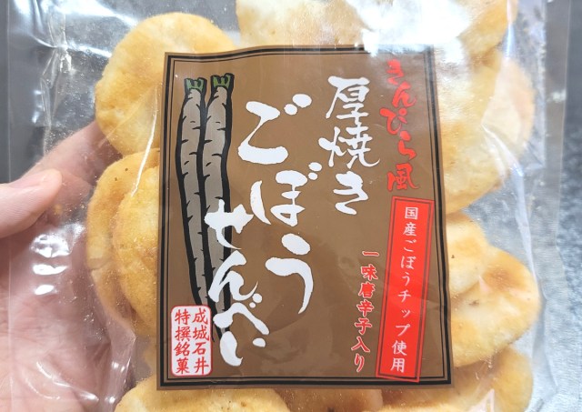 その代わりと言ってはなんだが、個人的に最も気になっていた「厚焼きごぼうせんべい」を少し味見してみることにした。最も味の予想がつかないものがこれであった。