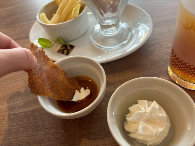 試食会では、「ホイップクリーム」と「キャラメルソース」がトッピングとして提供された。先ほどの美味しい生地に、トッピングを加えて味変を楽しめるのが嬉しい。