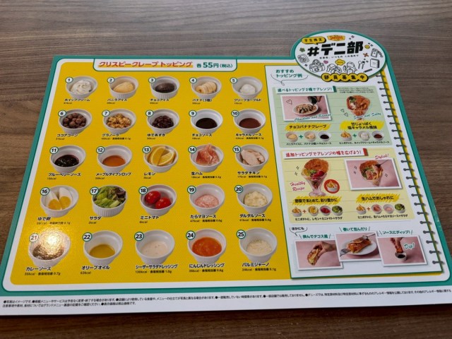 クレープのみの商品もあるが、メニューによっては25種類の中から2種類のトッピングを選べるのだ。