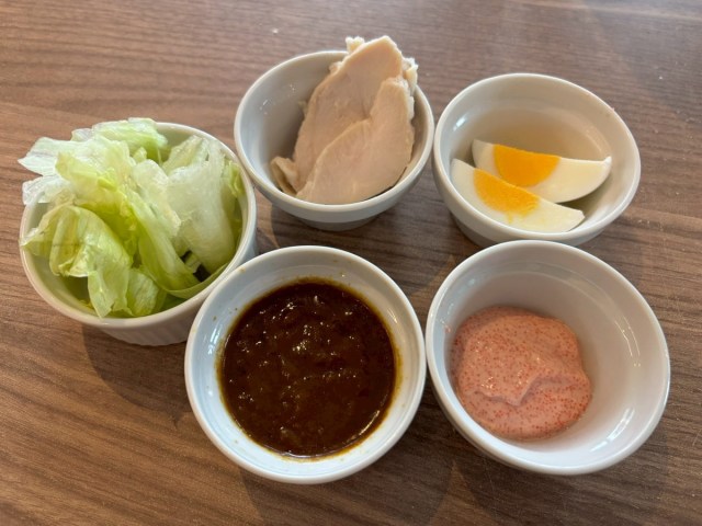 甘いものもいいけど、食事系の味も気になり、特別に「サラダチキン」「ゆで卵」「カレーソース」「たらマヨソース」「サラダ」の5種類も試させていただいた。