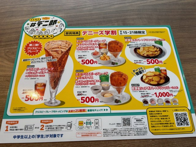 学生(中学生以上)は、平日15時〜21時の時間帯限定で、学生証の提示またはデニーズアプリ内の「デニ部学生証」を見せると、今回紹介したメニューを500円で楽しめる。
