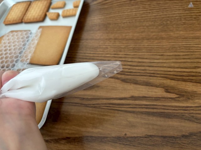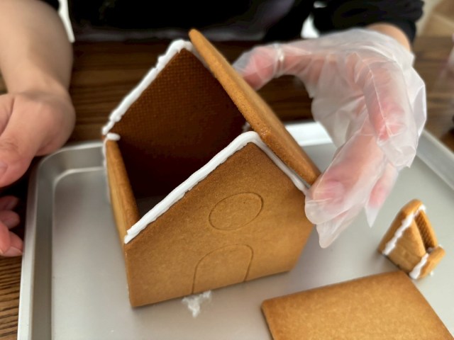 早速アイシングを絞ってパーツを固定していく。パーツを見ながら、建築士の友人が「これは切妻屋根だね」とボソリ。そんな名称があったのか!