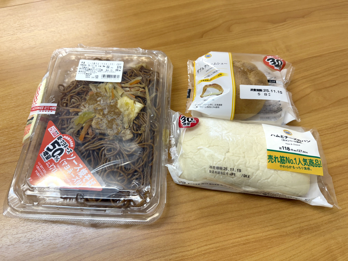 で、今回はその中から「ソース焼きそば」「ハムとチーズのパン」「ダブルシュークリーム」の3品を購入。50%増量になっているのは「ソース焼きそば」だけだが、結論からいうと……